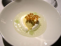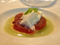まぐろのマリネのブリニ、青リンゴのゼリーとジュニパーのアイスクリーム