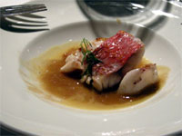 赤いmullet(ボラ?)といかのフェネル風味、夏のベイクドビーンズソース**