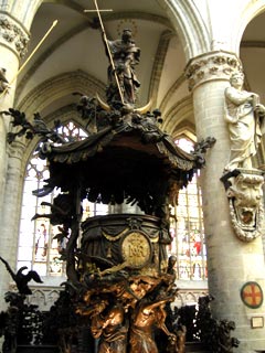 美しいステンドグラス(左下)と16世紀バロック様式の説教段(右下)が有名。