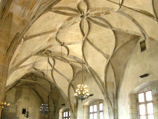 左下のヴラディスラフホール、天井の梁の模様が綺麗です。