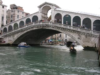 有名なリアルト橋。商店が橋の上に並んでいます。左右の端と中央を歩けます。