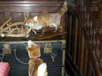 部屋の隅できつねの剥製を見つけた、大ちゃん。