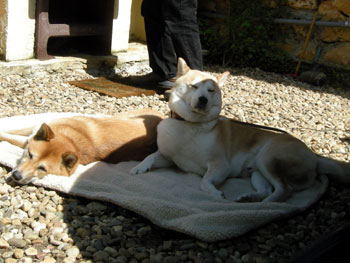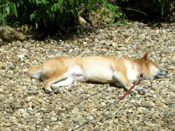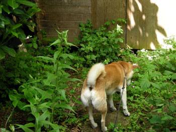 大変!柴犬が行き倒れてます〜!(笑) 大輔は隅々まで庭の匂いをチェック中。