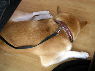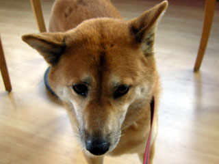 テーブルの下でおとなしく待っている大輔と