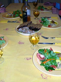 前菜にフォアグラとサラダ、メインはきらきらさん持参のイノシシの赤ワイン煮込み。
