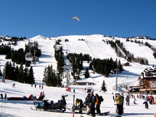 ゲレンデではパラグライディングを楽しむスキーヤーも。